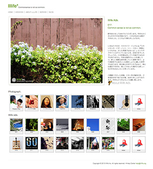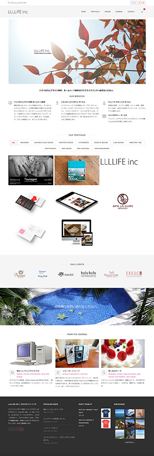 そして、現在のウェブサイトです。ワードプレスで作成した、レスポンシブ ウェブサイトです。使い勝ってもよく、弊社お得意のグリッドデザインです。中程のプールの写真は、ハワイに移住した時にはじめて暮らした、思い出のコンドミニアムのプール。『これから何しようかなぁ』 とぼんやり考えながらよく眺めていた風景です。