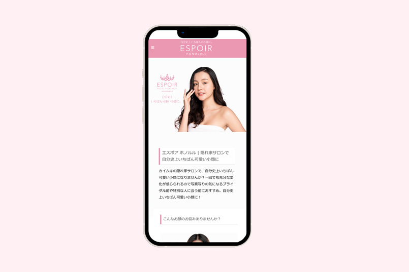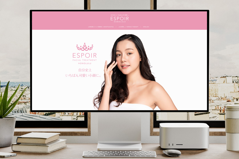 エスポアさんは創業された2014年からお仕事をさせていただいており、ティアラをモチーフにしたコーポレートロゴ、サービスを紹介するウェブサイト、紙の広告媒体デザイン、ホームページや広告で使用する写真撮影を担当させていただきました。創業から7年にあたる2022年春、ウェブサイトをリニューアルしました。TOPページにはモデルさんの写真を採用し、シンプルでありながら大胆にレイアウト。また、先日記事でも書かせていただいた、Googleビジネスプロフィールの構築も担当し、お店をより見つけやすく仕上げています。