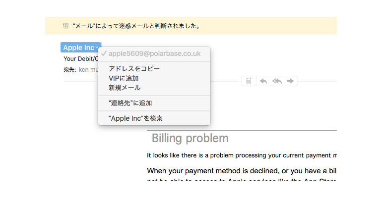 Apple Inc.からのメールでないことがわかります。
