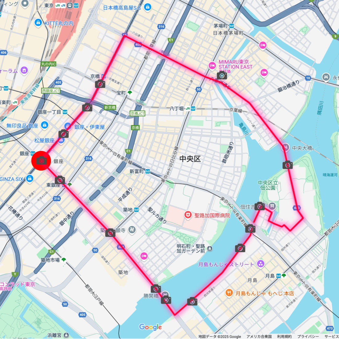 長期の旅行で一番困るのが、日々のエクササイズです。移動もあるし月極で契約できる好みのジムも少なく、毎回悩む懸念材料です。そんな時は、道具も少なく気軽に短時間でも楽しめるランが一番良いかもしれません。今回の日本滞在でも、ノープランで街中を走ったのですが、銀座+下町のランニングコースは、短距離ですが走りやすく景色もいいのでお勧めできます。赤丸の銀座四丁目交差点をスタート地点として、ぐるっと情緒のある下町を巡り、銀座三越までの一周約6kmの毎日のエクササイズに適したシティーランです。人通りが増える前に早速スタートしましょう!