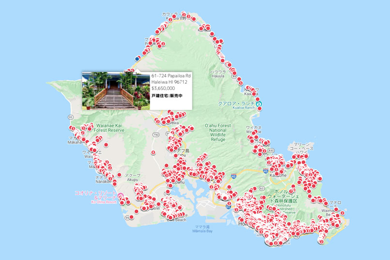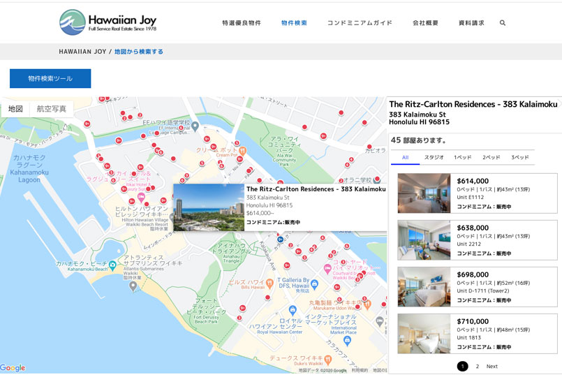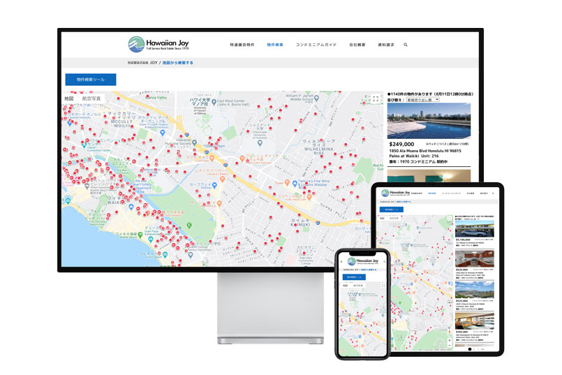 ハワイアンジョイ マップ検索(https://www.hawaiianjoy.com/map-search/)は、オアフ島全域の販売されている一戸建て、コンドミニアム、商業物件、そして土地に至る不動産物件の検索が可能です。パソコンはもちろん、iPadやiPhoneなどの端末にも対応したレスポンシブデザインで制作しています。