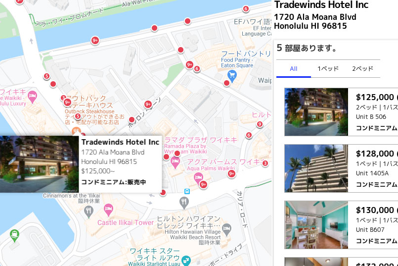 こんなことを思い出しながら、楽しく検索できるのがマップ検索機能のいいところでもあります。ご旅行でハワイにいらしてステイしたことがあるコンドミニアムや、想い出のある町や気になる場所などぜひ検索してみてください。もちろん老舗の不動産会社様のウェブサイトですので、購入をご検討の方に一番使いやすい仕様になっておりますので、是非一度お試しください。
