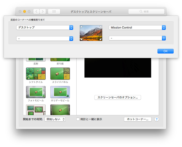 画面のコーナーへの割り当て」というのが出てきます。これはカーソルを画面の四隅に持って行った時に、様々な画面を呼び出せる機能で、僕は右上に「Mission Control」、左上に「デスクトップ」を設定しています。