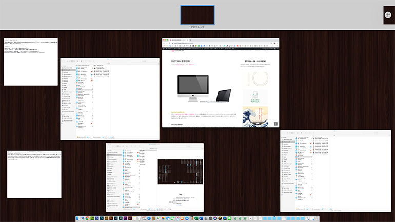 マウスを右上のコーナーに持っていくと、開いている全てのフォルダーなどが縮小され一覧できる「Mission Control」画面が表示され、必要な画面を選択することができます。