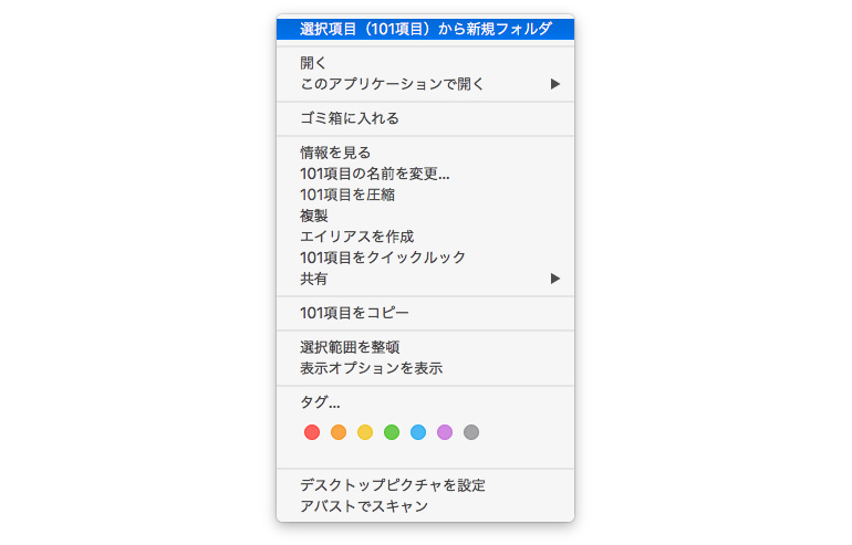 選択した書類を右クリック(もしくはcontrolを押したままドラッグ)してください。すると開いたメニューの一番上に『選択項目から新規フォルダ』というのがありますので選択、すると…
