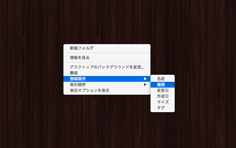 再度整頓しましょう。余白部分を右クリック(もしくはcontrolを押したままドラッグ)してください。メニューから 整理順序 > 種類 をクリックで、再び整頓しスッキリしたデスクトップの仕上がりです!