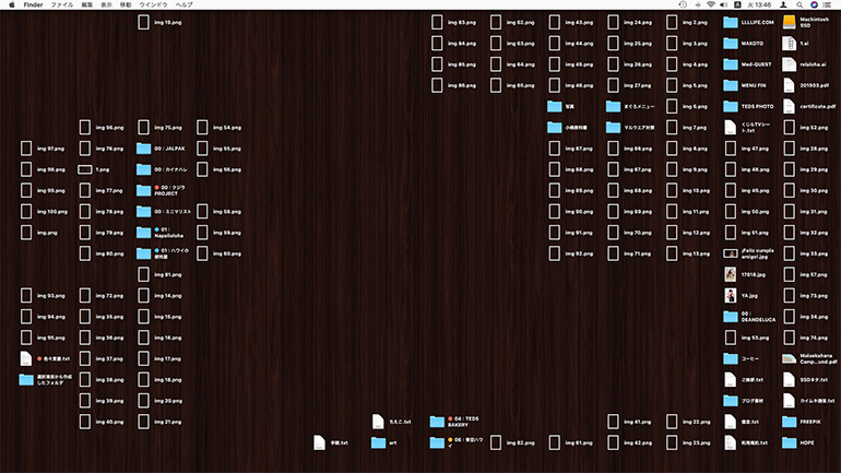 先日、友人のパソコンを見た所、とんでも無くデスクトップが荒れておりました。各種フォルダーが入り乱れ、使ってるんだか使ってないんだか、なんだかわからない様々なファイルが混乱していました。そういえば、あの人もこの人も、あんな人も同じようなデスクトップだったなぁ、と思い出したついでにデスクトップの簡単な整理の仕方をシェアしてみようと思います。こんな有様でした…