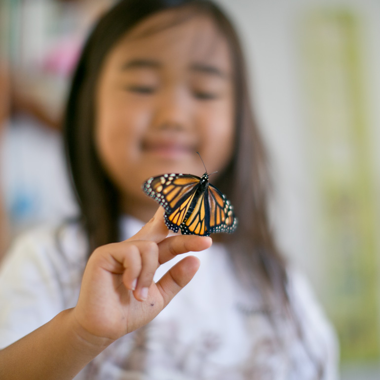 さなぎになって5-7日くらいでチョウになります。あざやかな黄緑色のさなぎが、黒っぽくなったら翌朝に羽化します。数時間じっと羽を乾かし、ハタハタと飛び立つ準備を整えて、ふんわり風に乗って飛んでいきます。この子は別のいも虫のご飯用に持ち帰った葉っぱに付いていた、卵から育ったオオカバマダラ。写真はムスメとチョウのはお別れの挨拶です。