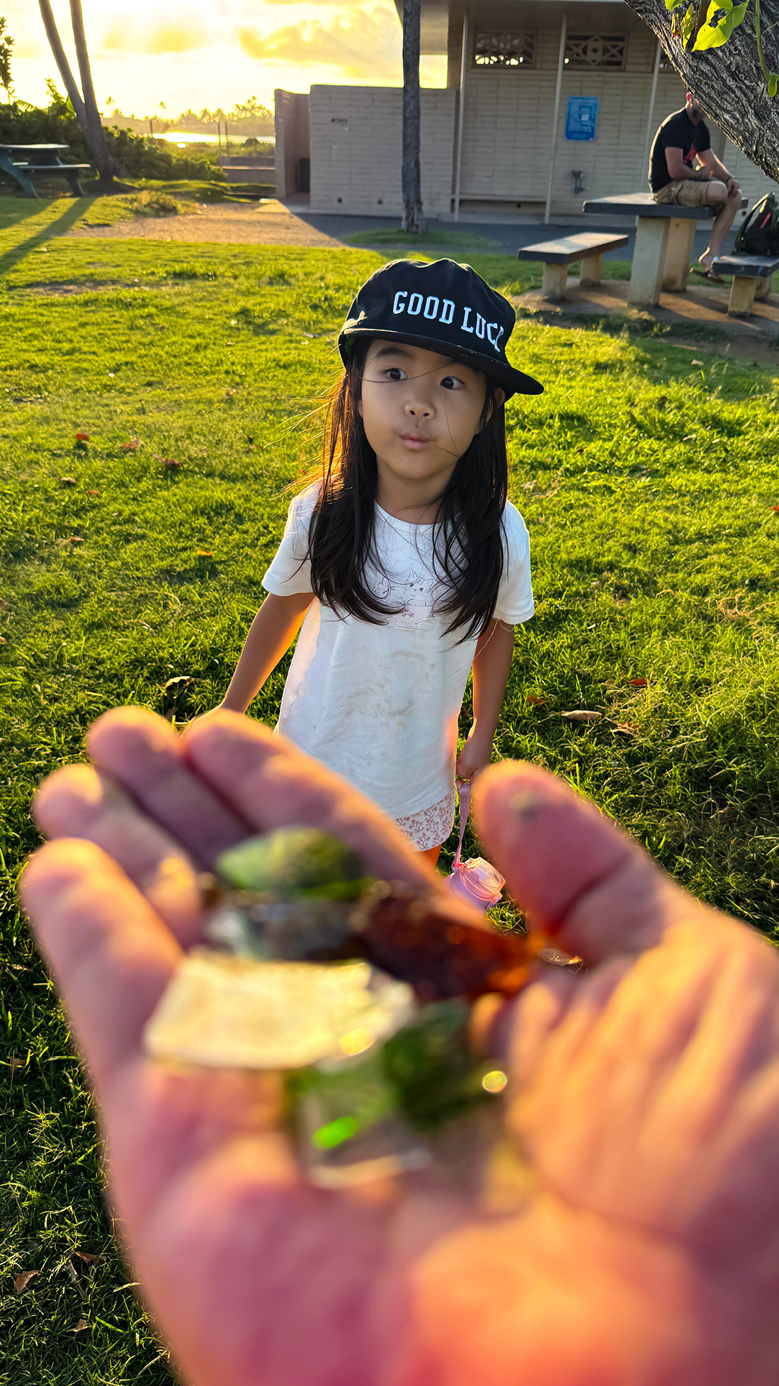 娘とビーチを散歩中、またもやビーチにガラスの破片が散乱していました。たかだか50メートル範囲に、大少様々いっぱいのガラス片を見つけました。海に磨かれたシーグラスではなく、尖った鋭利なガラス片です。裸足で歩ける遠浅が特徴的なクリオウオウビーチなので、ビーザン履いて歩いている人など一人もいないビーチ。平然とルールを破るのは大人だよなぁ。