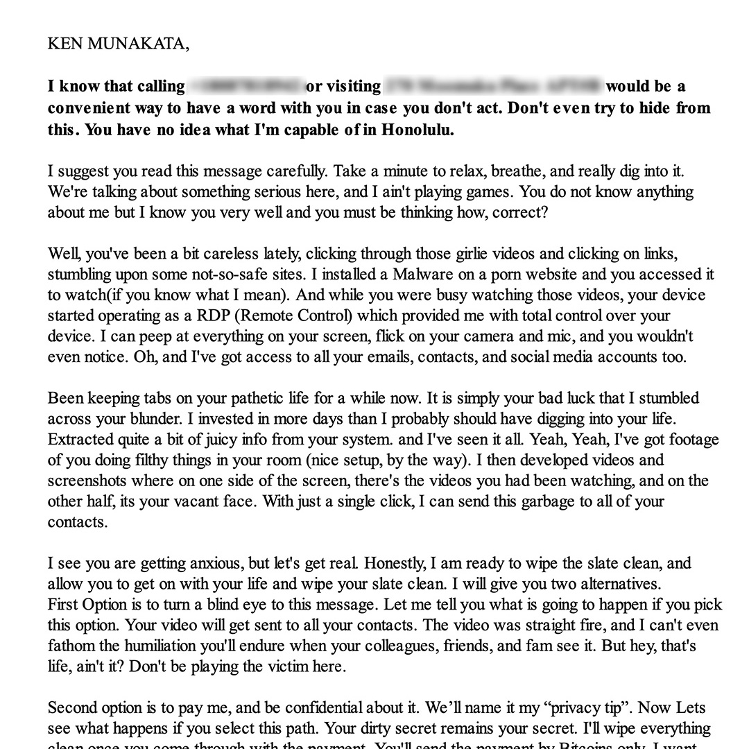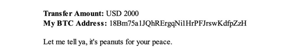 それでもって、最終的には「この事実をバラされたく無かったら、私のビットコイン口座に振り込みなさい」という振り込め詐欺仕立てでした。