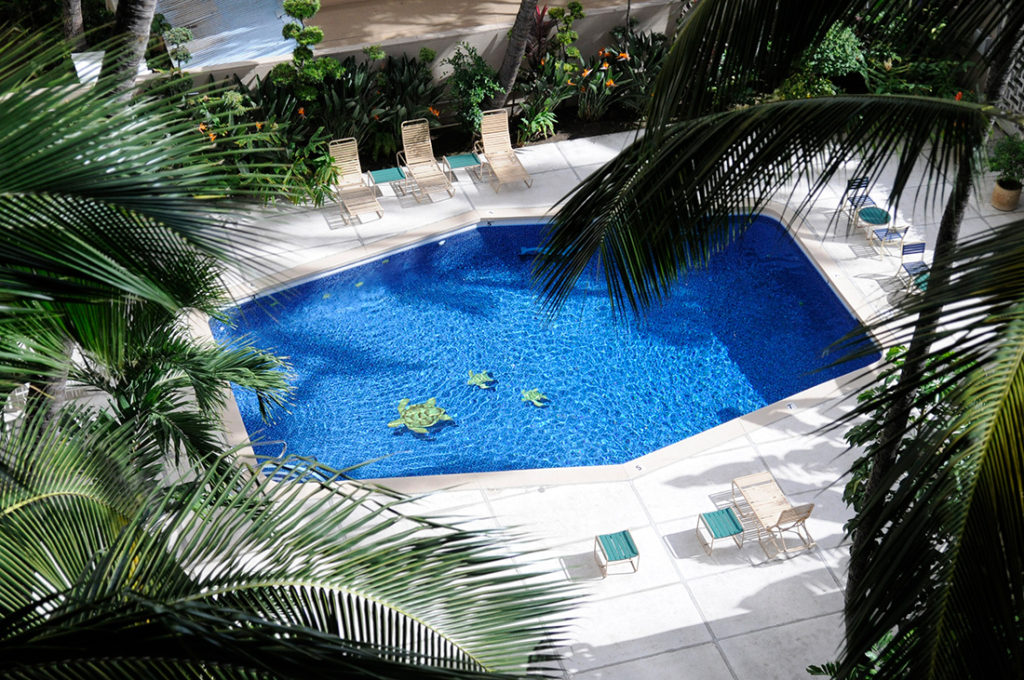 親子のカメが泳ぐ、コンドミニアムのプールの写真。ワイキキとアラモアナの中間にある、アラモアナブルーバード沿いのThe Tradewindsというホテルコンドで、2006年夏に移住して初めて住んだコンドミニアムです。会社を辞めた僕は、ノートと鉛筆を片手に、これからどこへ進むかを、このプールサイドで考えたりしていました。体をかすめる貿易風と、焼け付く強い日差しの中、将来に想いを馳せた思い出のプール。8階の一番端っこの部屋からの出入り時に、よく眺めていた光景を撮影。