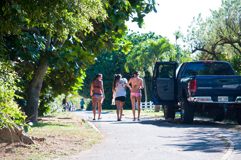 移住前の2001年秋ごろ、自転車でオアフを一周したことがありました。ワイキキのホテルを出発し、東回りでぐるっと周り、途中サンセットビーチのゲストハウスに一泊しました。夕方にサンセットビーチまで裏道を歩いて出かけ、少し冷んやりした砂浜で日が暮れるのを待っていました。この時にはじめてハワイに住む、ということを考えたのを覚えています。写真はその裏道で見かけたサーファーガールたち。